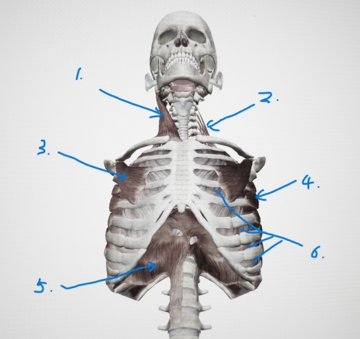 上図-吸気の筋⇒2.斜角筋 3.小胸筋 4.前鋸筋 5.横隔膜 6.外肋間筋⇒重要筋
