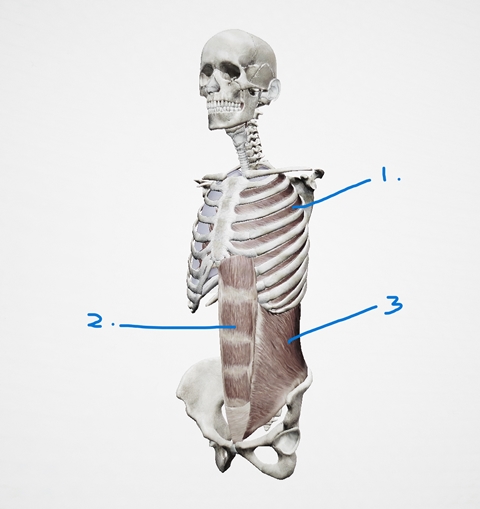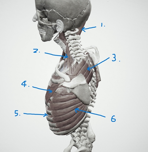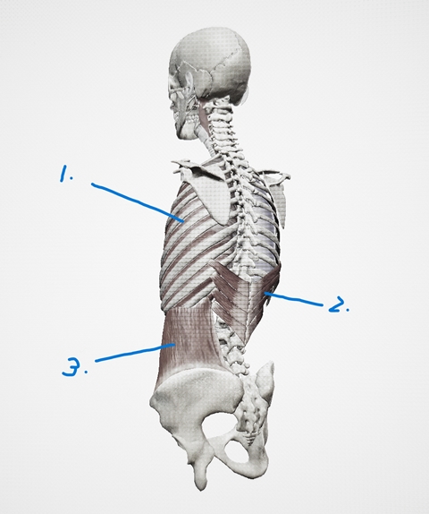 上図-呼吸の筋1.内肋間筋2.下前鋸筋3.腹横筋⇒重要筋