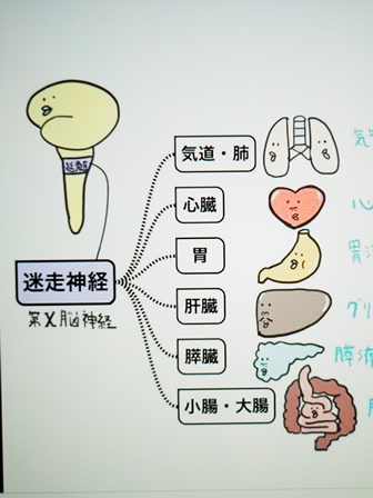 - 広大なネットワーク: 第Ⅹ脳神経として頭蓋底から発し、脊髄を通らずに直接、肺、心臓、そして横隔膜の穴(食道裂孔)を抜けて、胃、肝臓、膵臓、腸にまで神経枝を広げています。