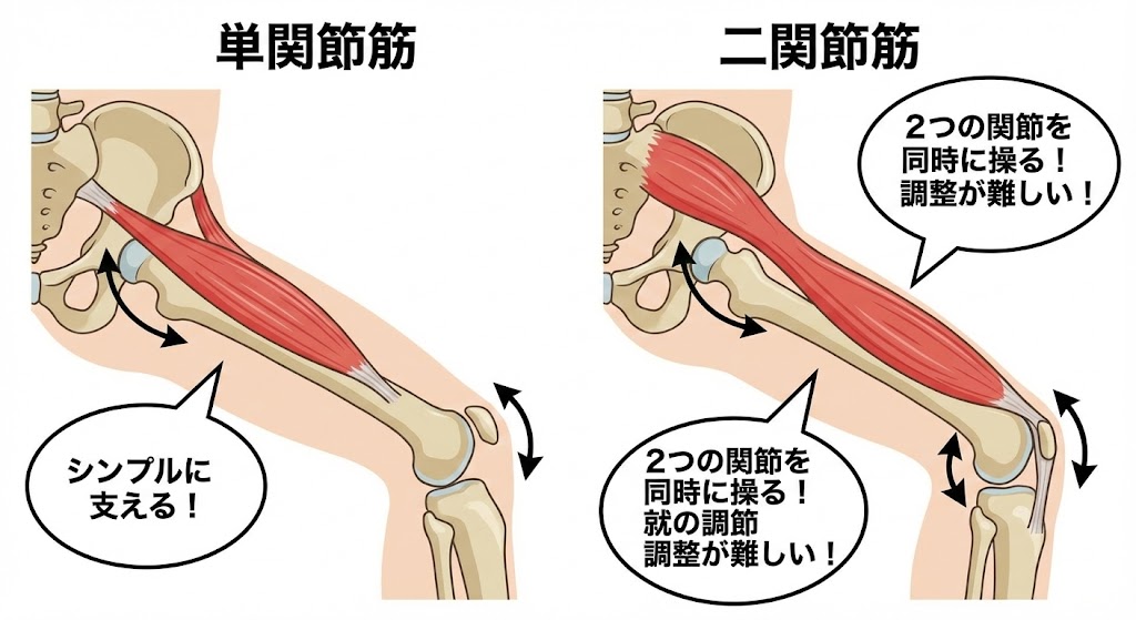 【イラスト図解3:「単関節筋」と「二関節筋」の違い】