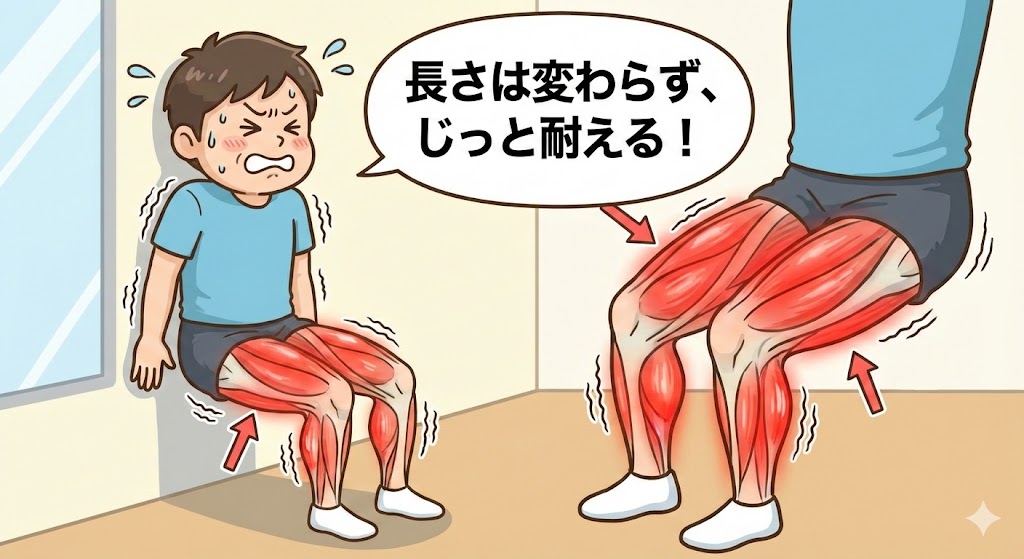 - しゃがんで静止(空気椅子状態): 全ての筋肉が「支える」モードでプルプル耐えています。