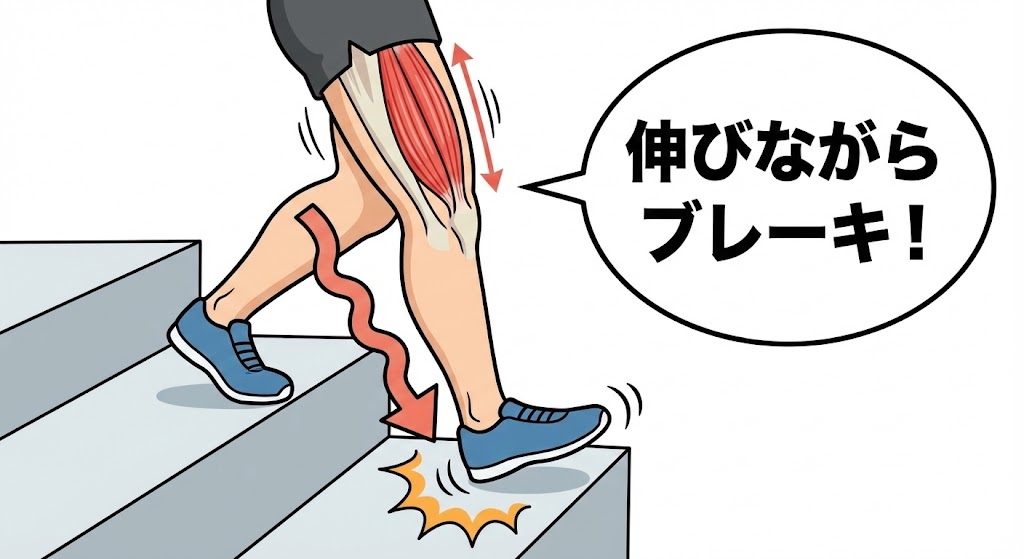 - 伸びながらブレーキをかける(遠心性収縮): 実はこれが膝痛にとって非常に重要です!