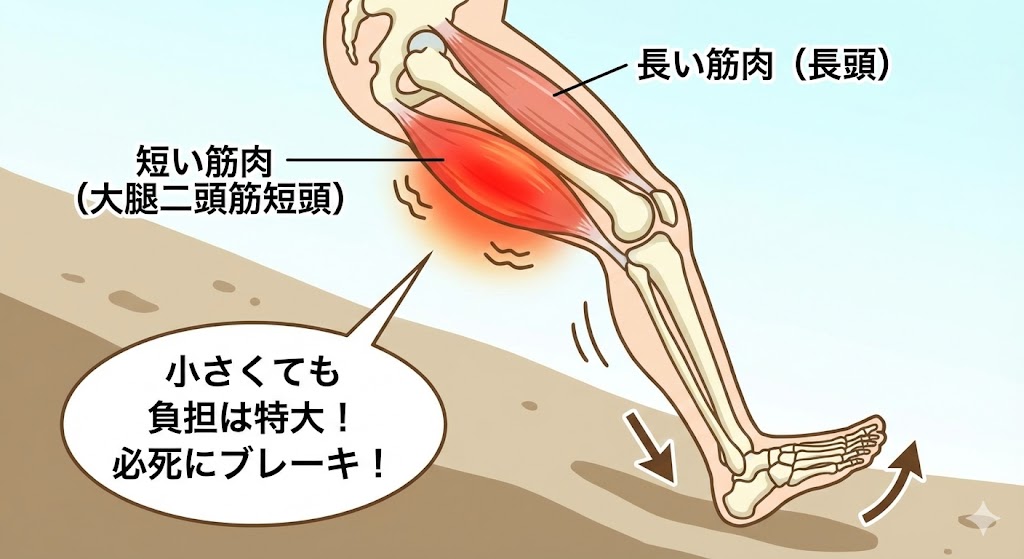 この「短頭」は、体は小さいけれど、膝を曲げながら支えるという重要な役割を担っています。しかし、小さいがゆえに負担が集中しやすく、すぐに疲労して硬くなってしまいます。 ここが硬くなると、ブレーキ性能が落ち、着地の衝撃が膝関節に直撃してしまうのです。