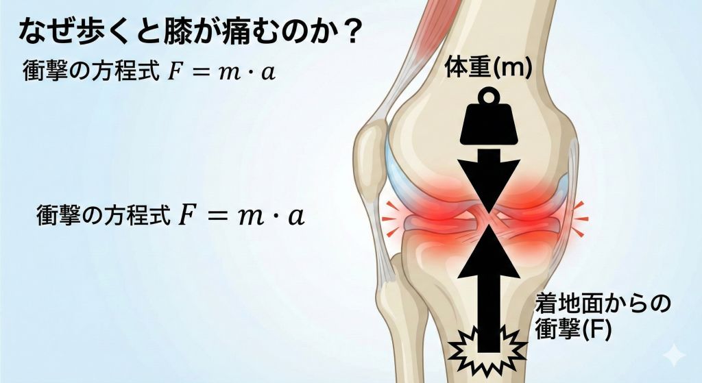 膝の痛みを感じる時、私たちの体には巨大な F(衝撃)が加わっています。体重(m)をすぐに変えることはできませんが、着地の瞬間に「ドスン」と止まるのではなく、和柔流の所作で a(加速度) を最小限にコントロールすれば、衝撃 F は劇的に小さくなります。