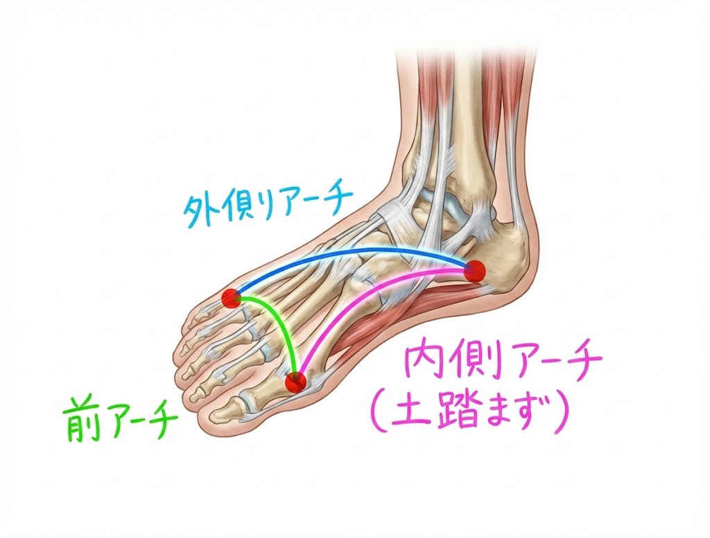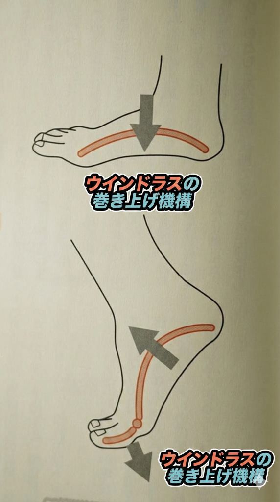 足の指で地面をグッと握ると、足裏の筋膜が巻き上げられ、土踏まずのアーチがバネのように持ち上がります。これを「ウインドラスの巻き上げ機構」と呼びます。