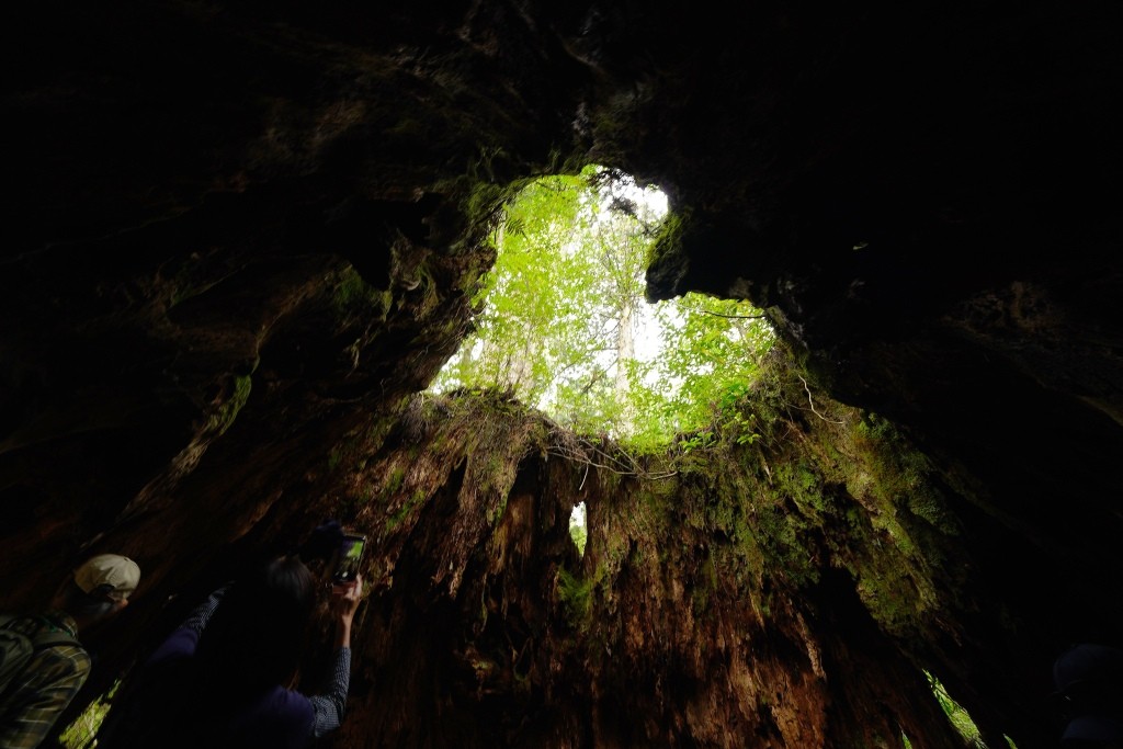 キャプション: 屋久島―ウイルソン株|切り株の中から見上げたハートの空